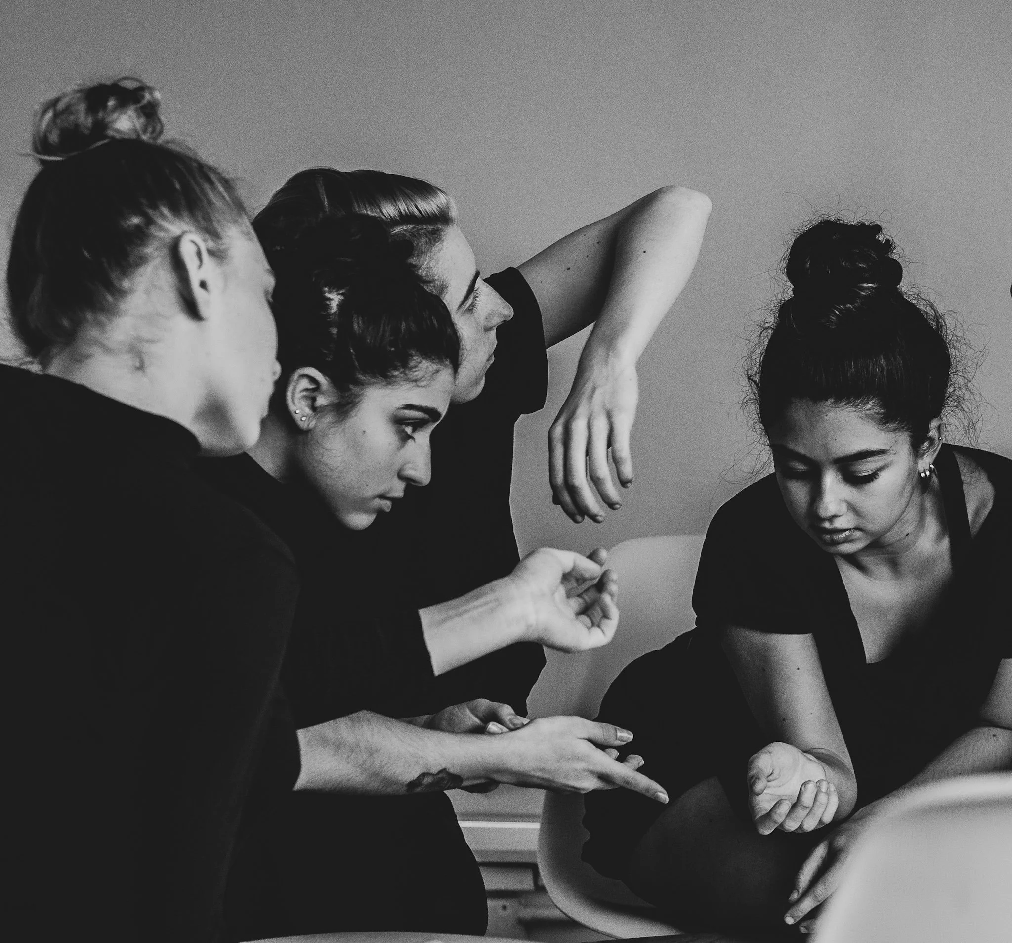 “[I]t felt as if the surfaces of their skin emanated vulnerability and receptiveness — a fascinating quality of stage movement. They explored the space, experimenting with different body shapes and configurations. As eerie music darkened the atmosphere, they drew together — gazing out at the audience, bravely blazing their personal essences.”